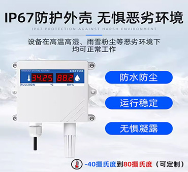 該傳感器帶有數(shù)碼管顯示功能,可實時顯示當前溫濕度,采用壁掛防水殼,多用于室外及現(xiàn)場環(huán)境惡劣的場合。